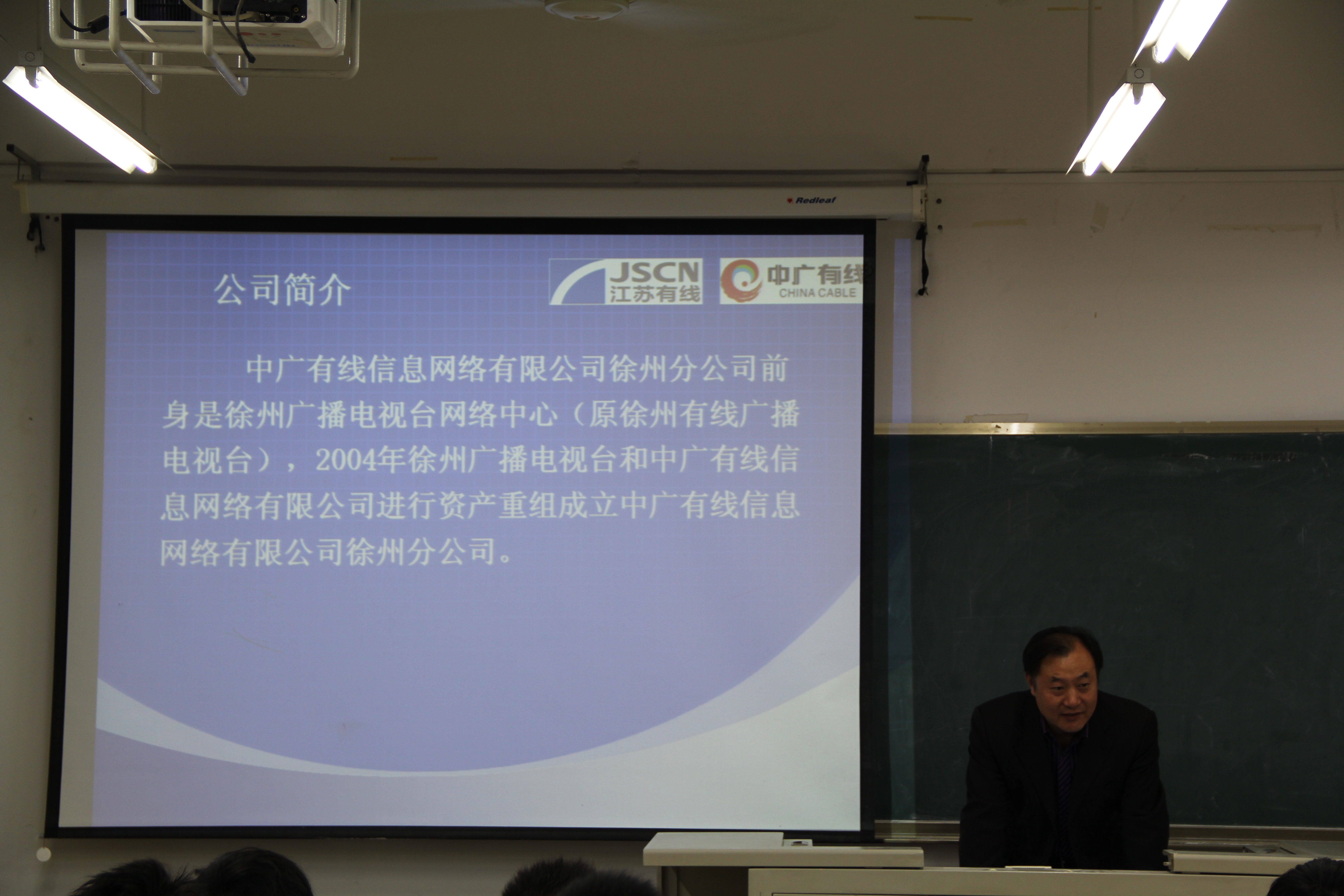 中广有线信息网络有限公司徐州分公司的纪总介绍了自己的公司情况及主要业务,然后讲述了实习的重要性及目的性,如何看待待遇,如何在单位发展,怎么实现自己的价值等,最后与各位毕业生交流、解答。