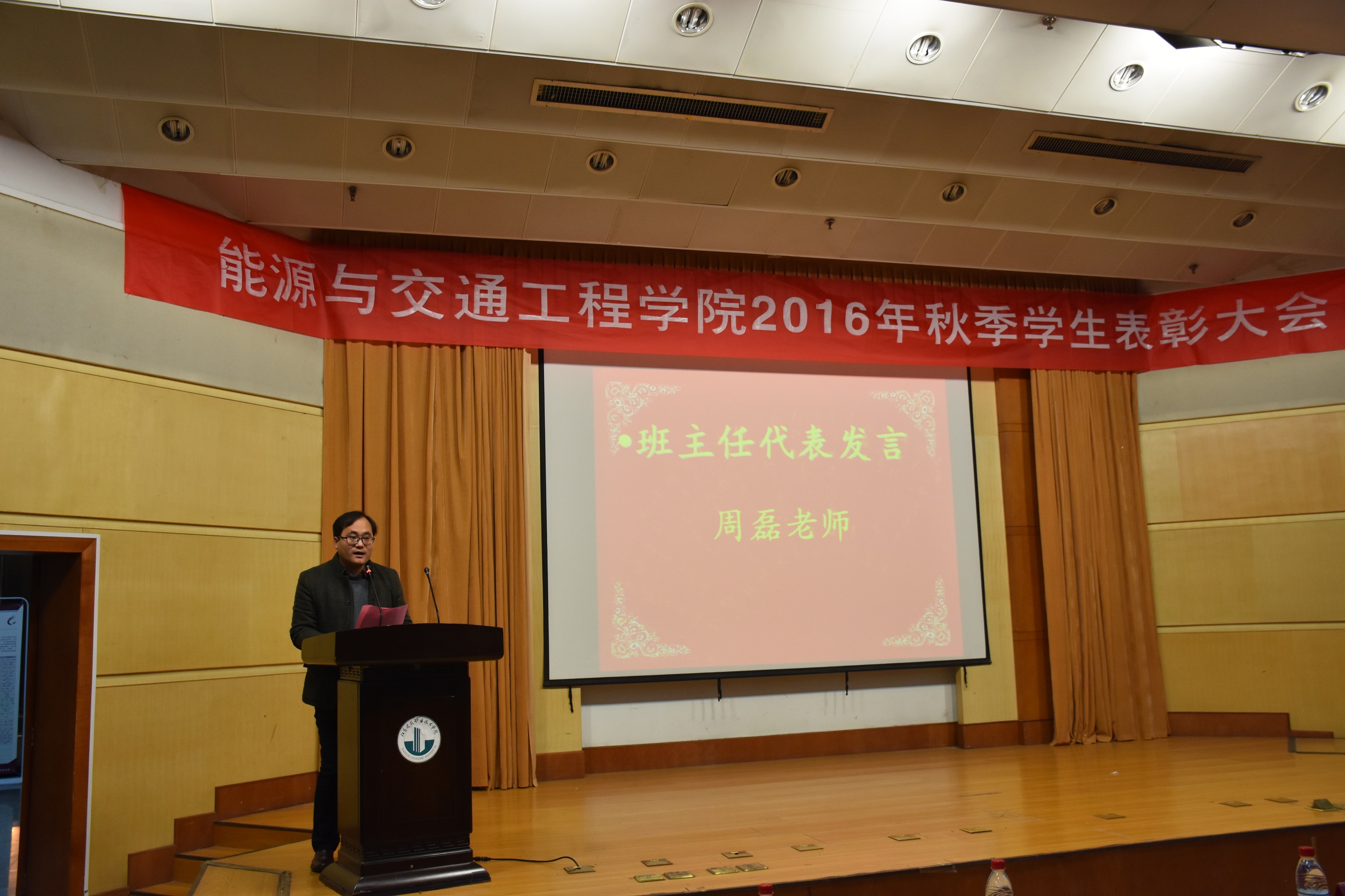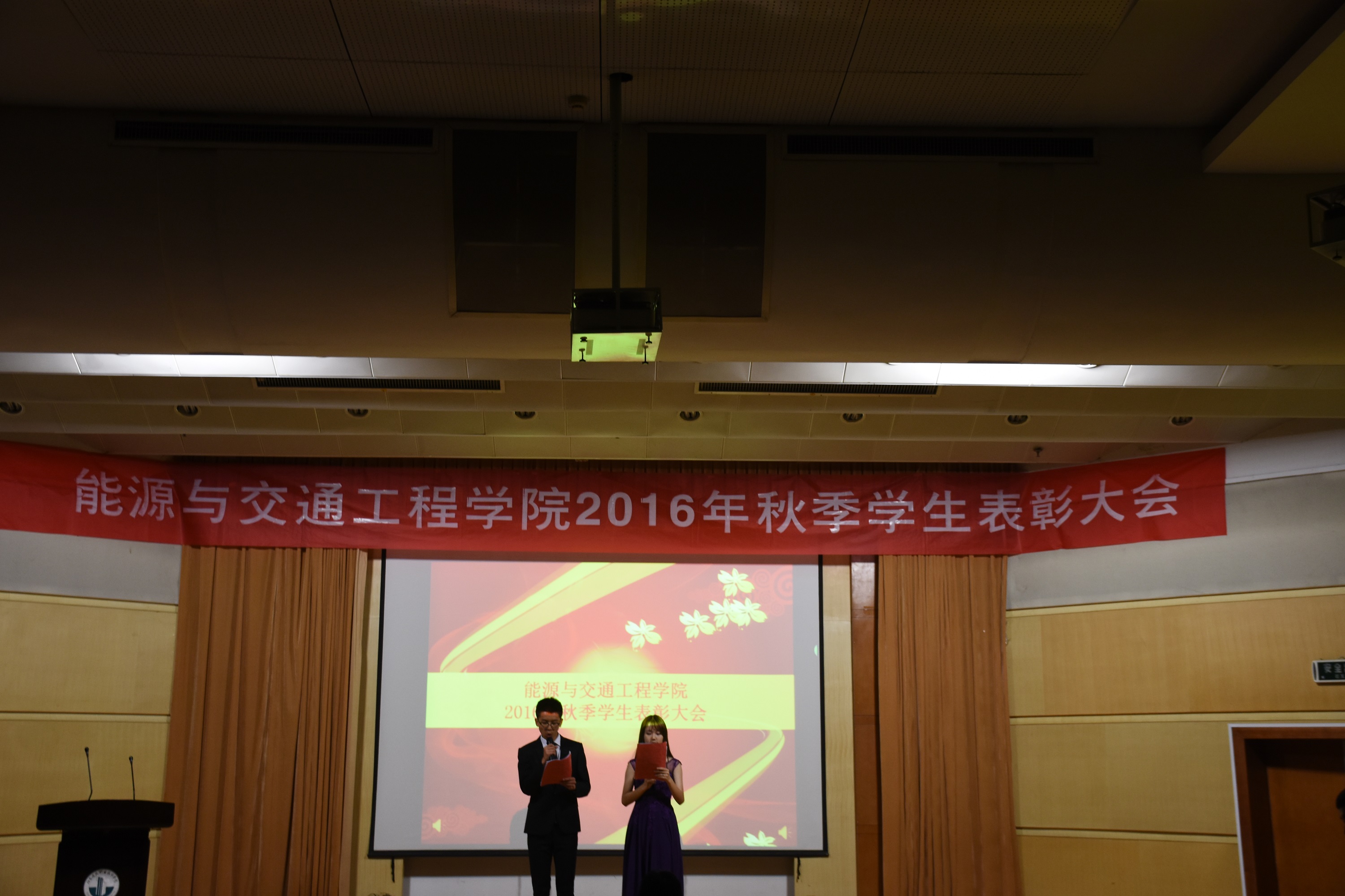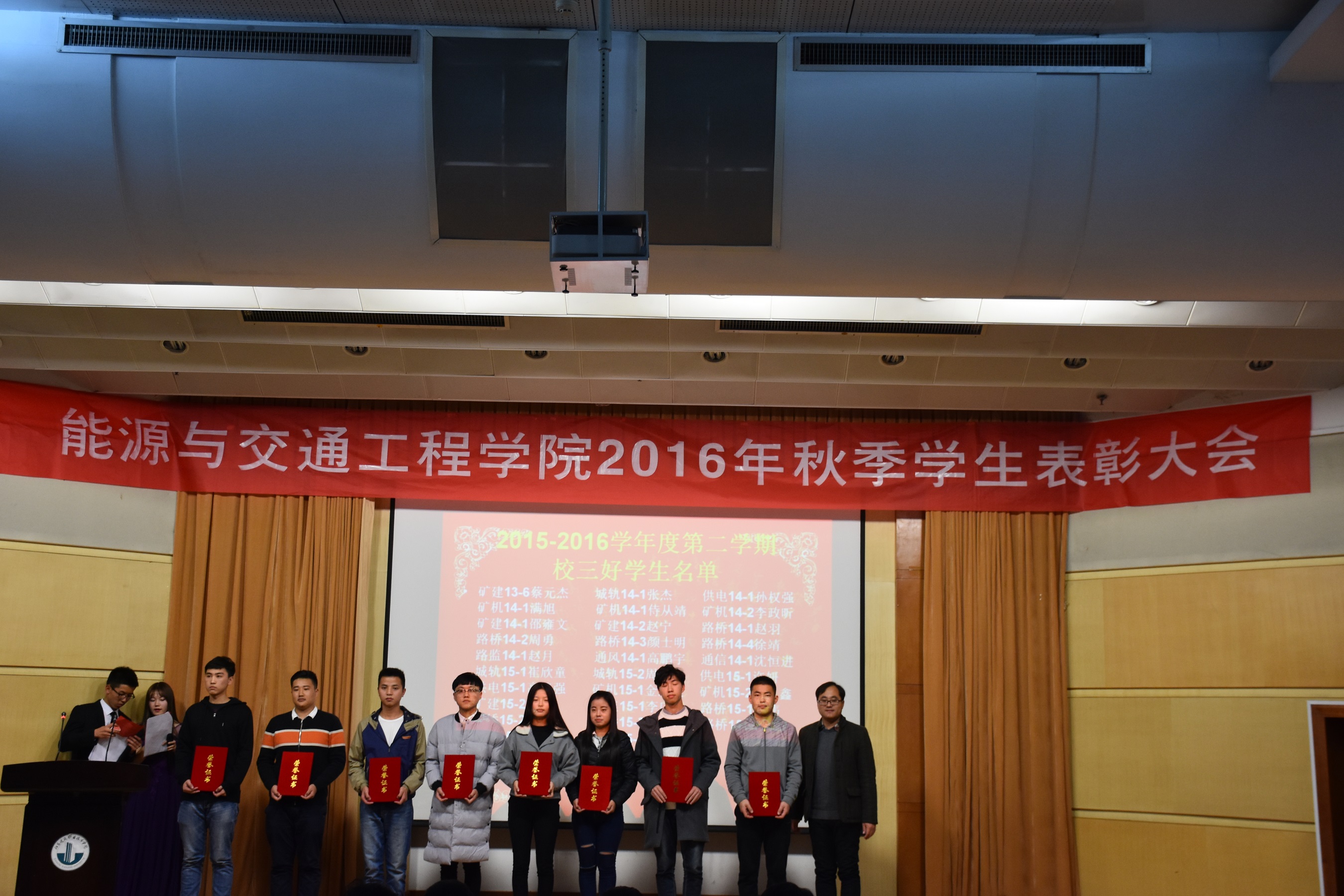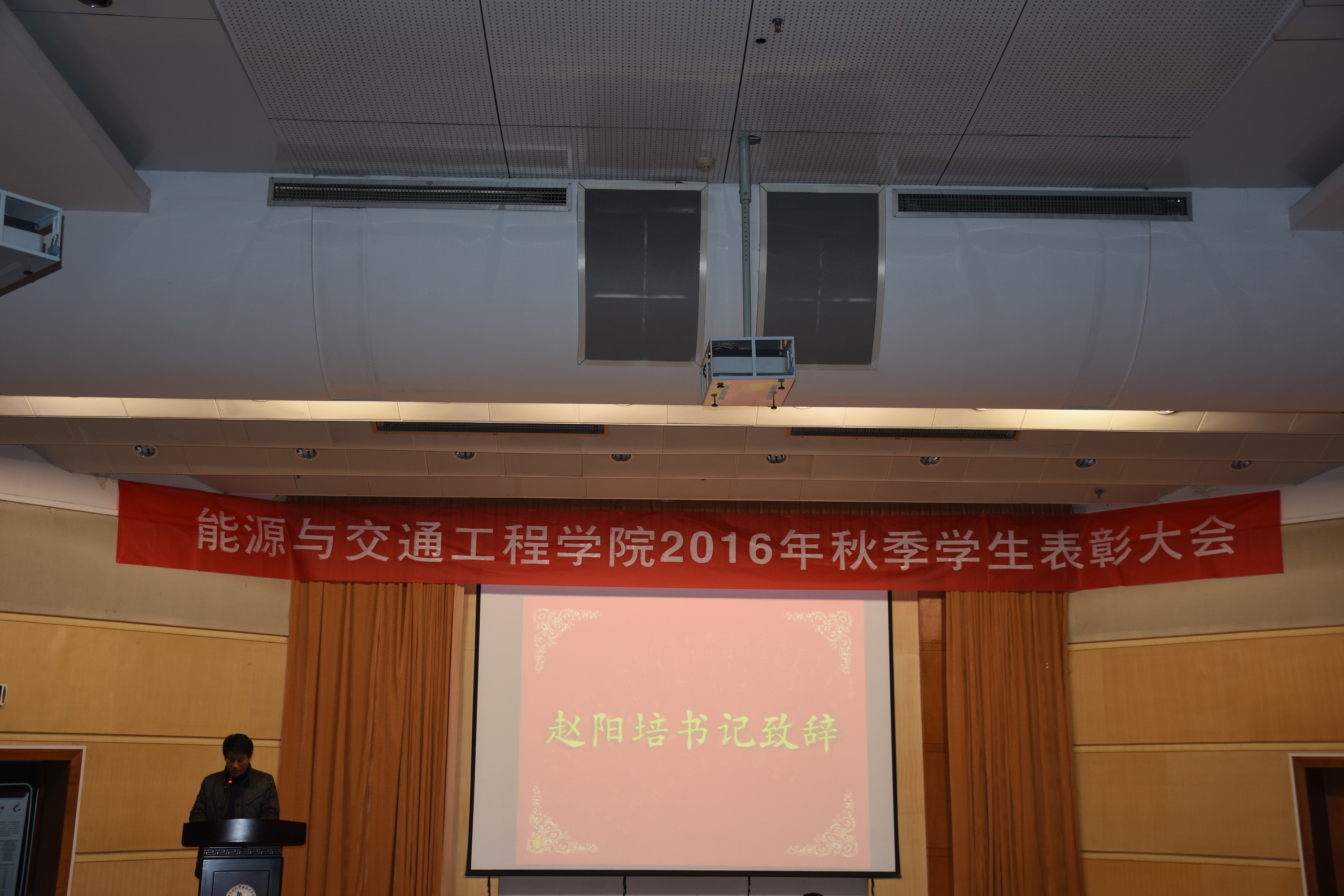 2016年11月20日晚19:00,能源与交通工程公司2016学年秋季员工表彰大会在学术报告厅举行公司党总支书记张魁老师、经理戚豹老师、党总支副书记赵阳培老师、副经理靳会武老师及专业负责人、全体专兼职辅导员受邀出席本次大会,2016级新生、大二大三班级代表共计400余人参加表彰大会