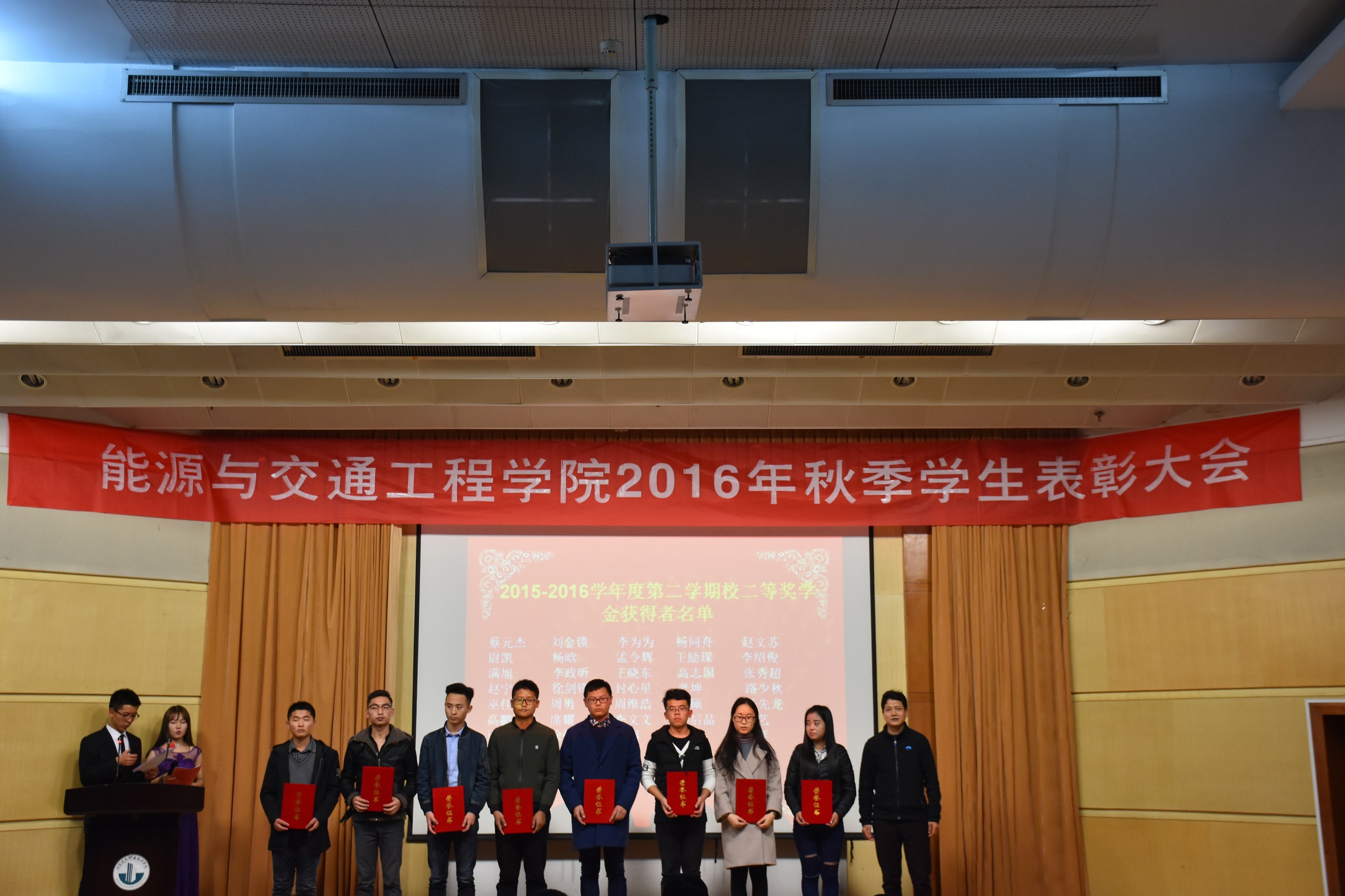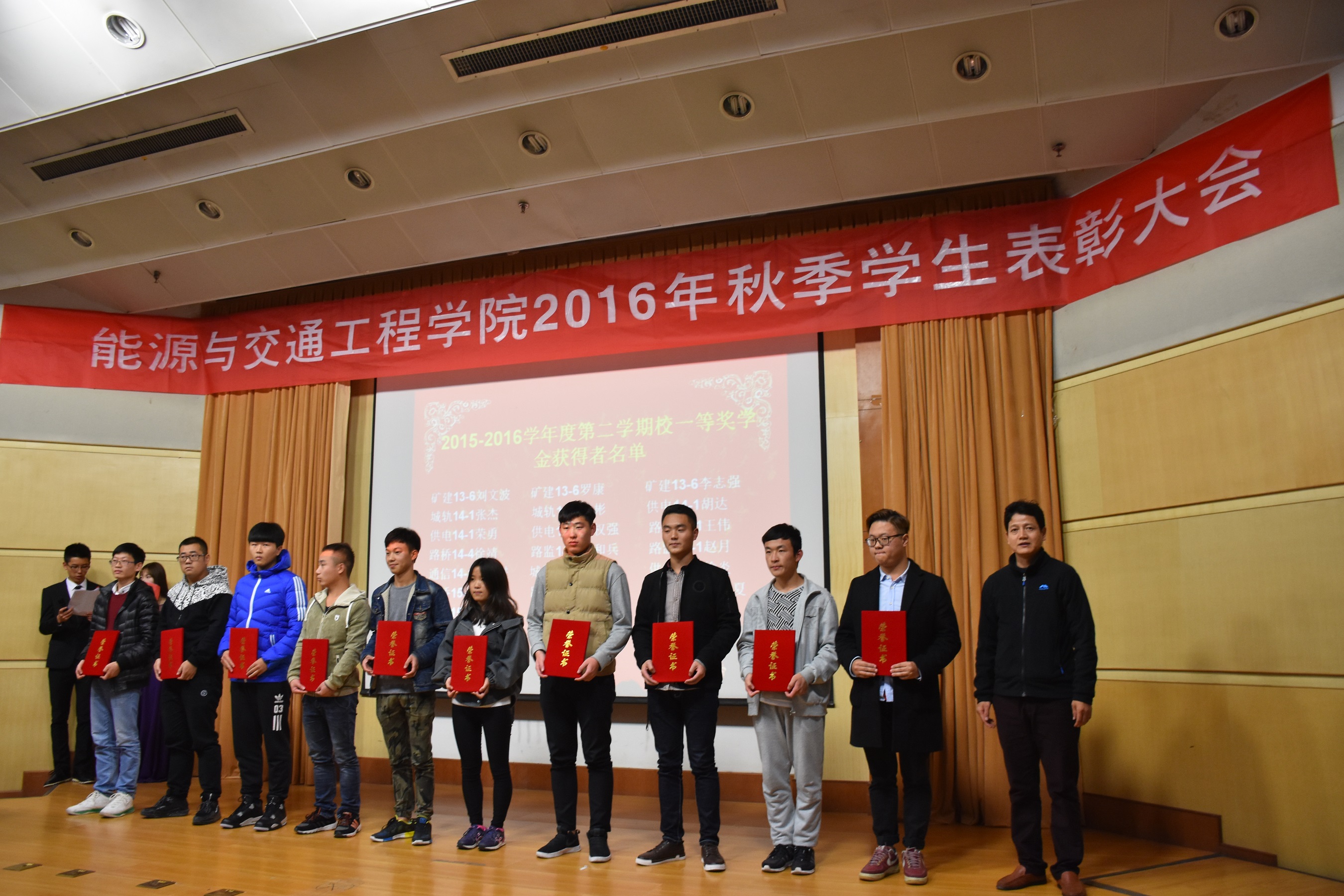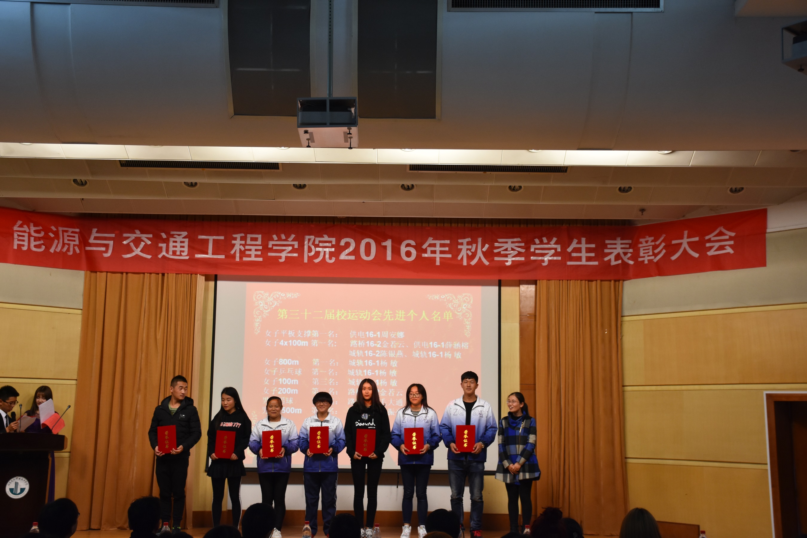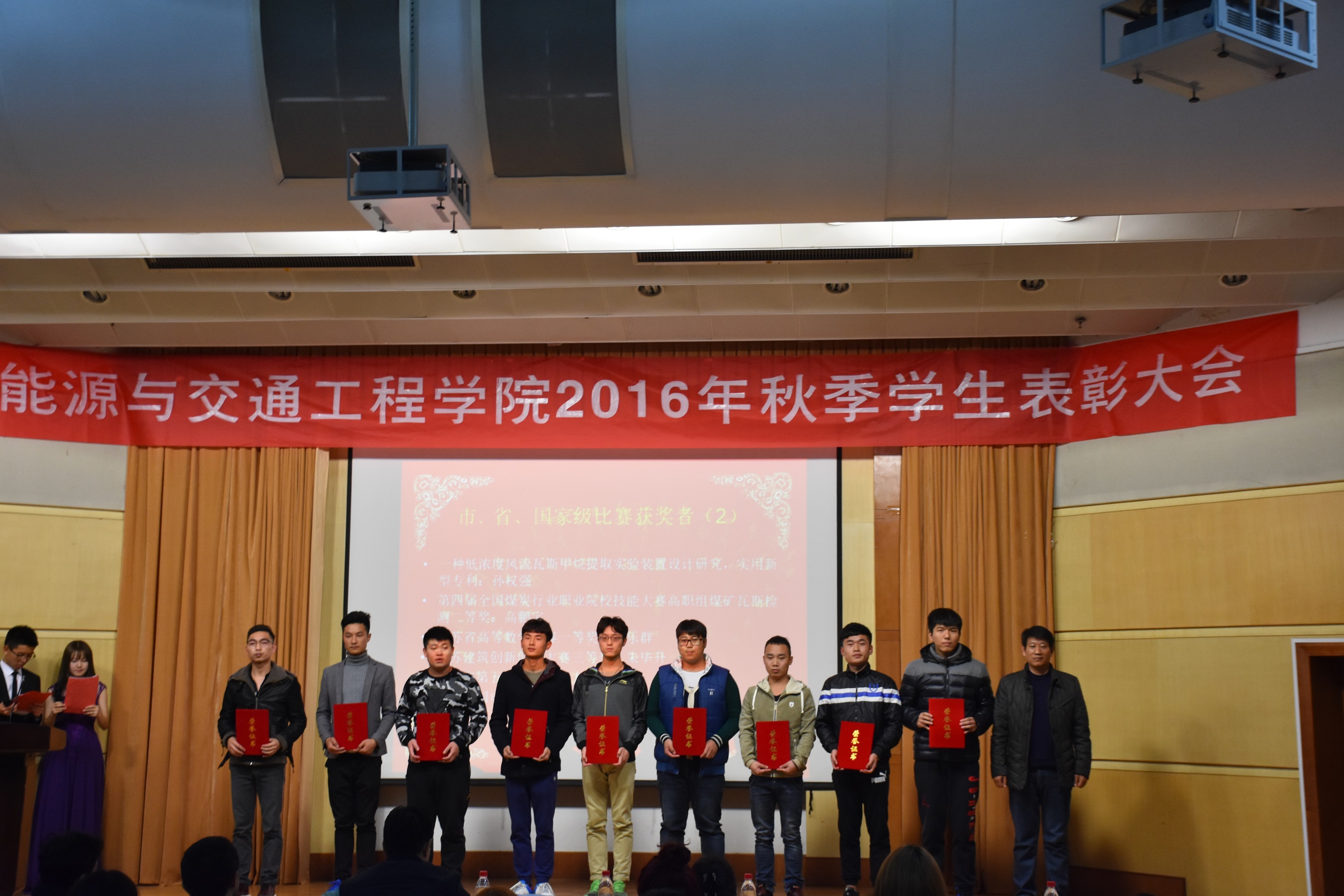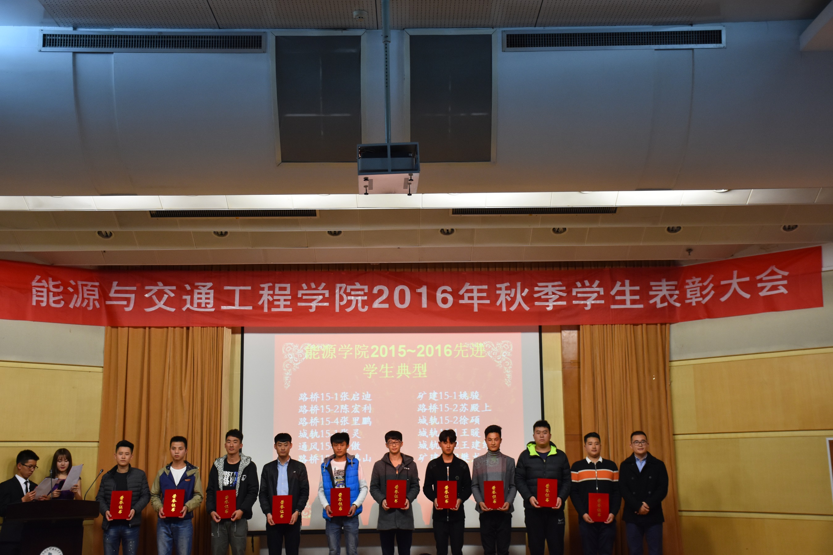 2016年11月20日晚19:00,能源与交通工程公司2016学年秋季员工表彰大会在学术报告厅举行公司党总支书记张魁老师、经理戚豹老师、党总支副书记赵阳培老师、副经理靳会武老师及专业负责人、全体专兼职辅导员受邀出席本次大会,2016级新生、大二大三班级代表共计400余人参加表彰大会