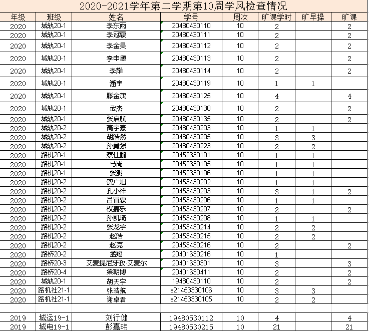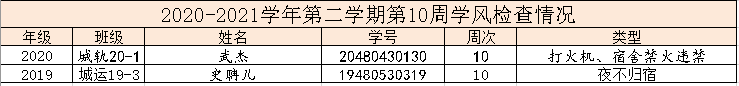 现将学院2020-2021学年第二学期第10周的文明修身检查结果进行通报,希望广大同学引以为戒。